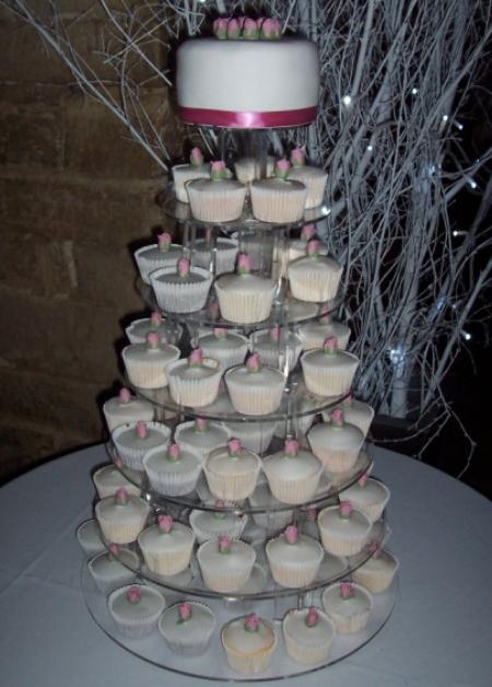 Tiers of individual fairy cakes, finished with sugar roses. Displayed on a perspex stand, and topped with a cutting cake.